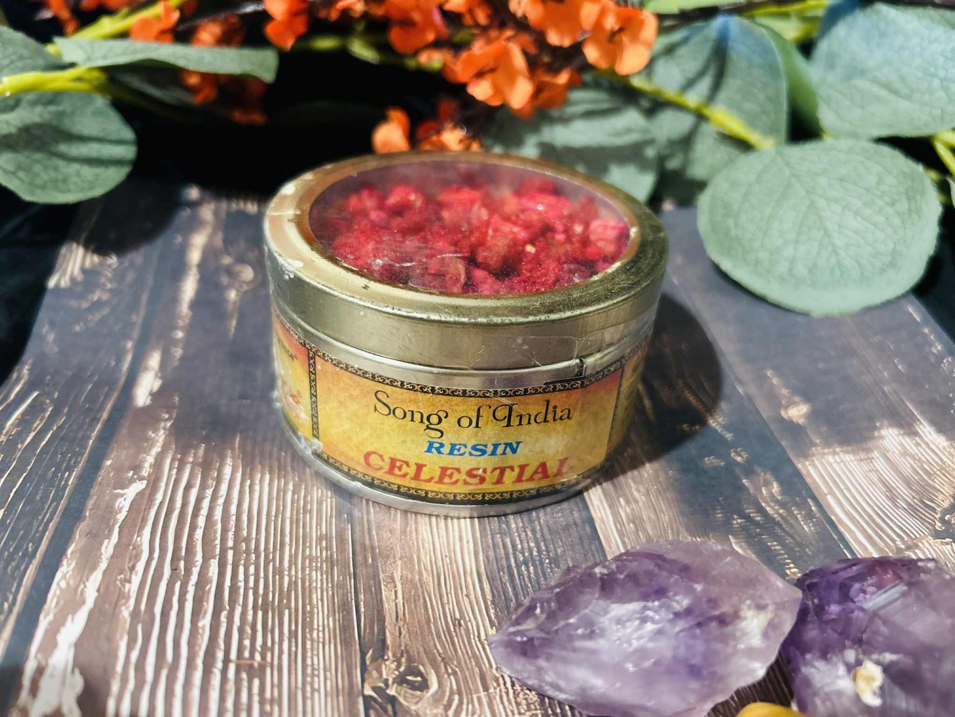 Song of India Celestial is a created resin. It is made from a natural resin base blended with natural essential oils and other aromatic plant-based ingredients. The purchase price buys 60g of resin packaged in a tin. The tin is 7.5cm across and 3cm high. It has a window lid and is very convenient for storage. As this product is packaged by weight the tins won’t be completely full. The size of the resin pieces varies a lot, the largest being roughly 3cm and the smallest being only 1-2mm.